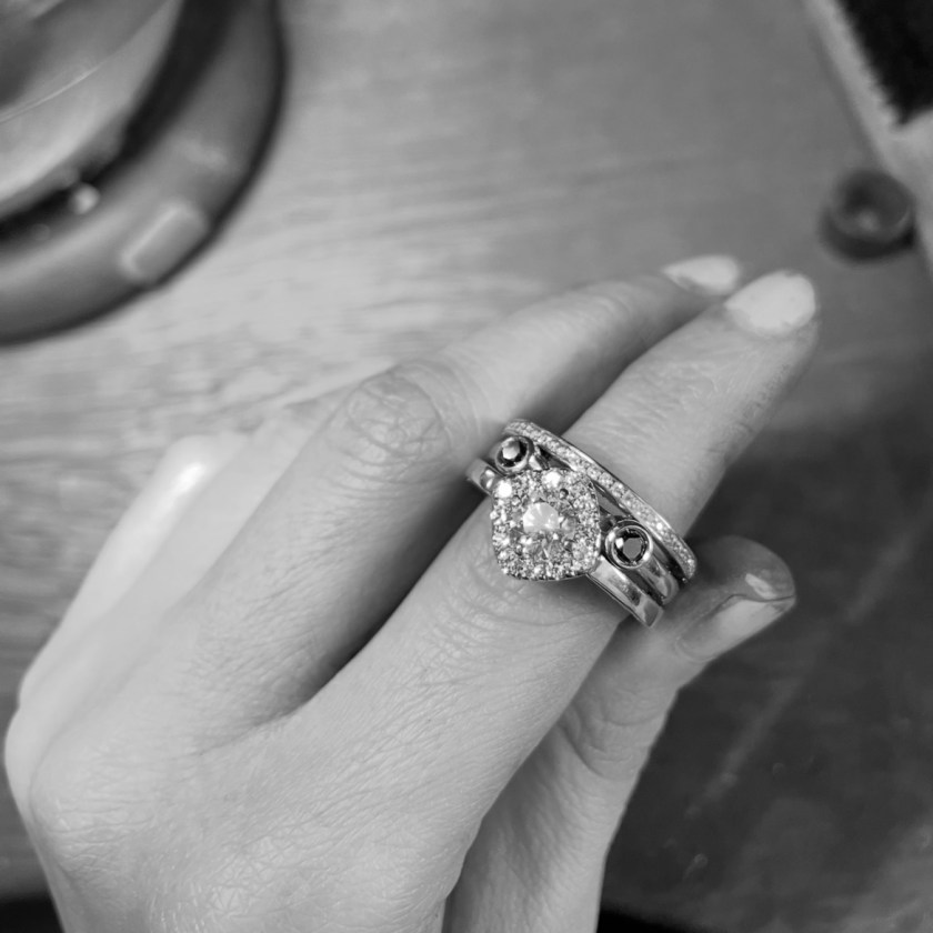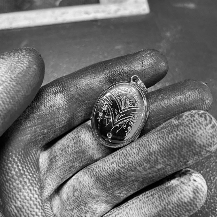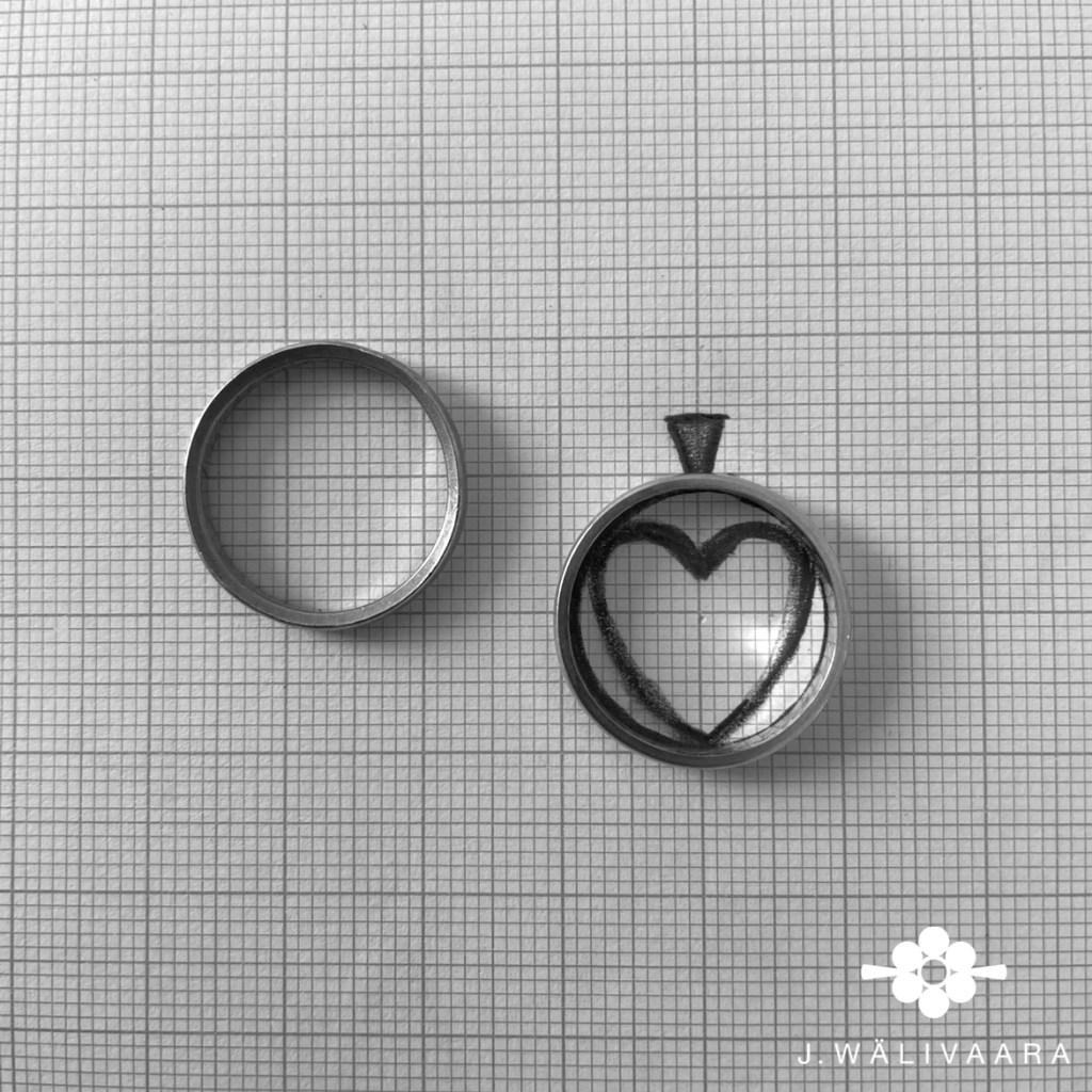 Ett exempel på omarbete som vi utfört är ett hänge där en ring har delats på mitten och formats till ett hjärta, placerat i en annan ring. Det går fortfarande att skymta gravyren på insidan av de båda ringarna. Sedan är öglan för kedjan från en bit av ena ringen.